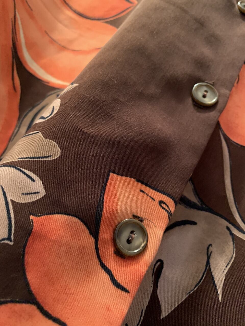 深みのあるブラウンカラーにオレンジカラーの大柄のフラワープリントが目を引く