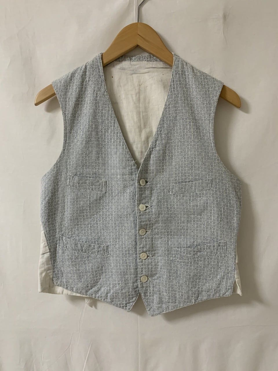 首裏に汚れ、裏地にシミ汚れ、シンチバックに汚れ、ボタンホールに緩みがございますが、この年代のものとしては悪くないコンディションかと思われます