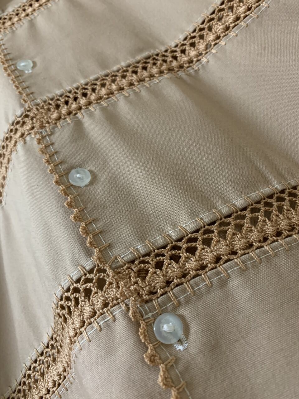 後ろ身頃の裾付近の編み柄に、小さなホツレがございますが、よく見ないと分からない程度の為、通常使用に問題はないかと思われます