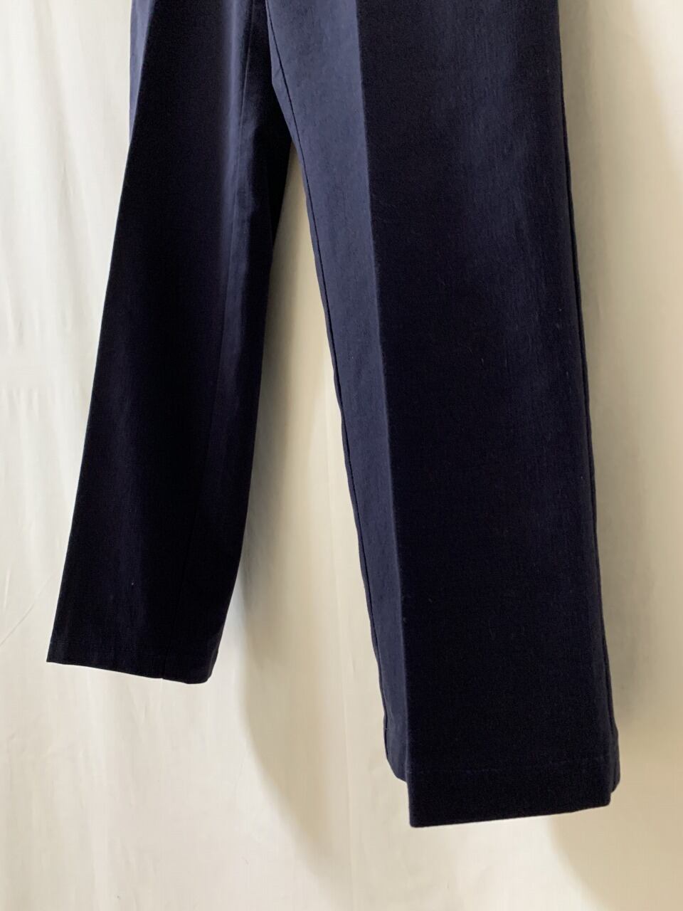 テーパードシルエットのネイビーカラーのパンツ