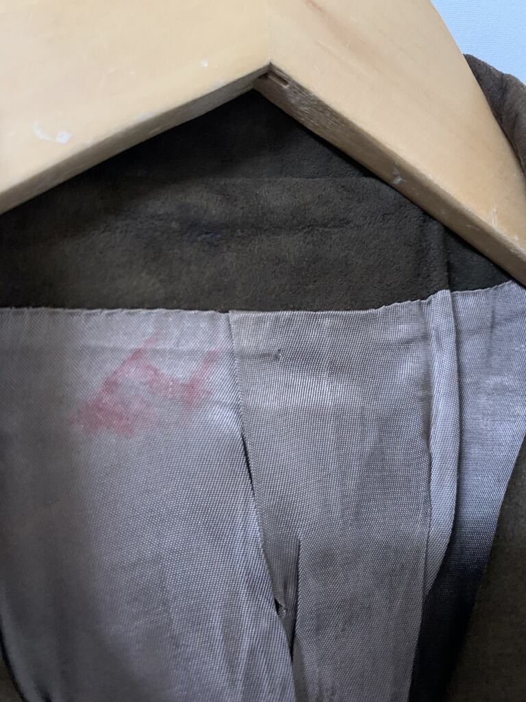 右肩部分にリペア跡、首元の裏地に汚れがございますが、リペア跡はあまり目立つものではなく、裏地の汚れは着用時には見えなくなるため、通常使用に問題はないかと思われます