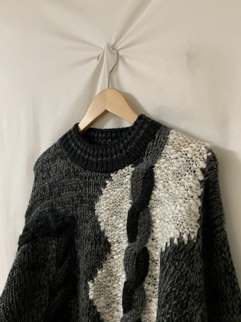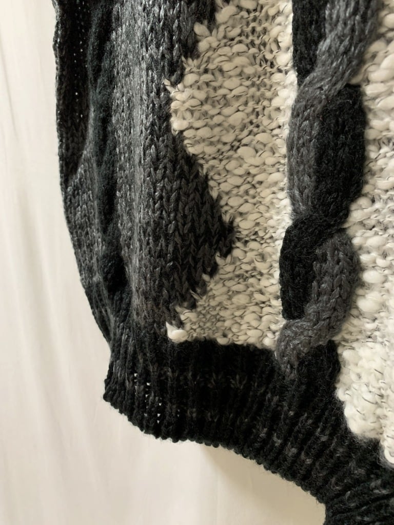 モノトーンカラーのアシンメトリーな編み柄デザイン