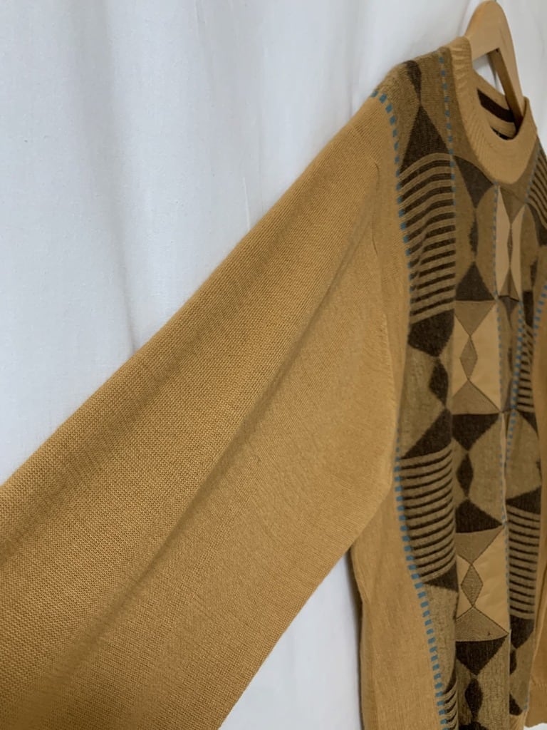 そこに重なるセピアブラウンやマヤブルーの編み柄と刺繍