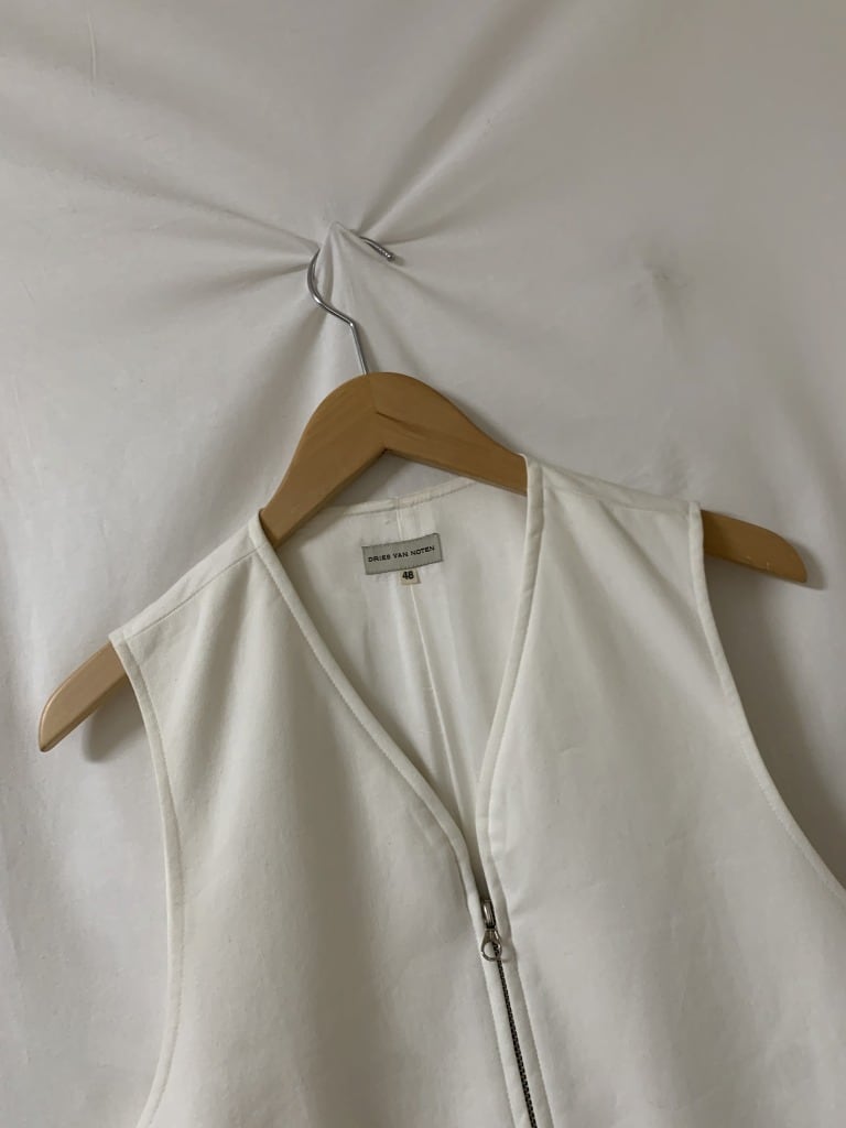 前身頃の裾付近に極小の汚れ、首回りに若干の汚れがございますが、よく見ないと分からない程度の為、通常使用に問題はないかと思われます