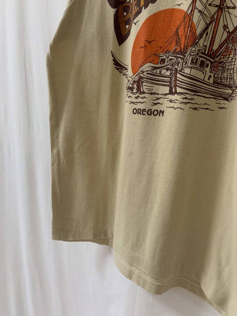 ベージュカラーのTシャツの各所に施された