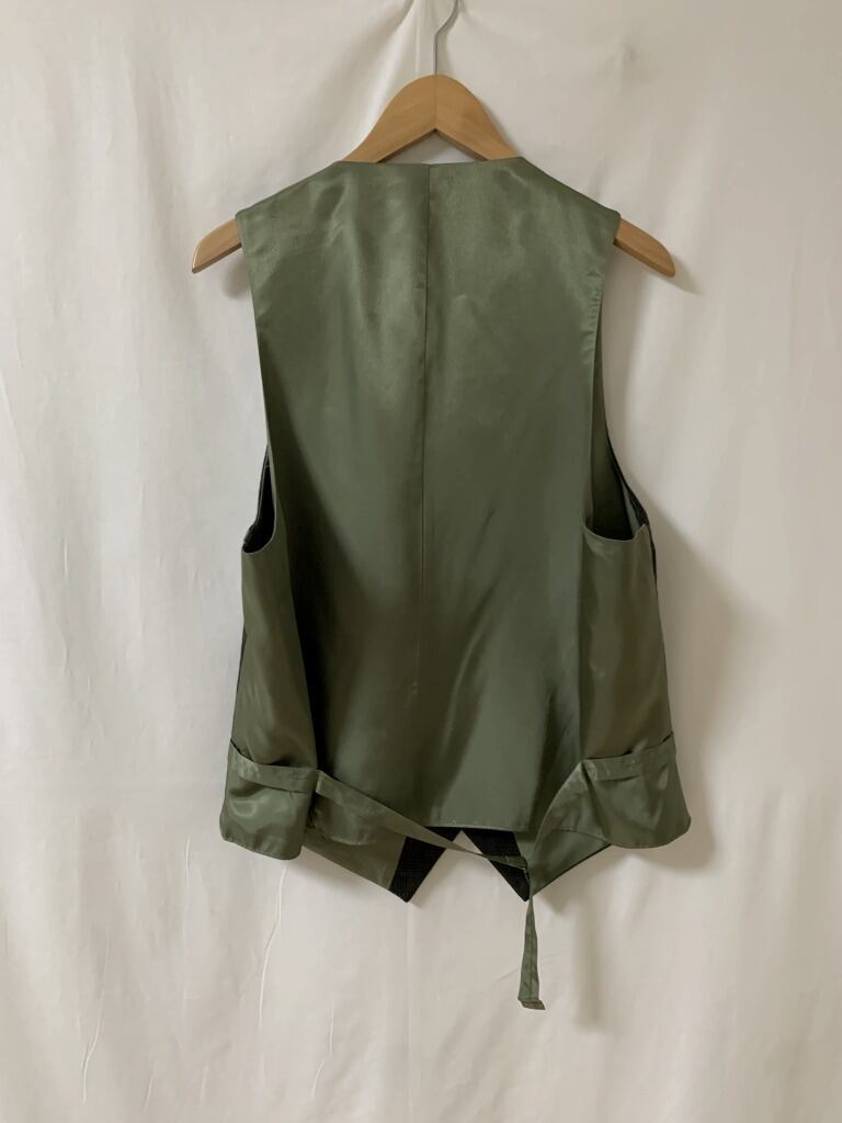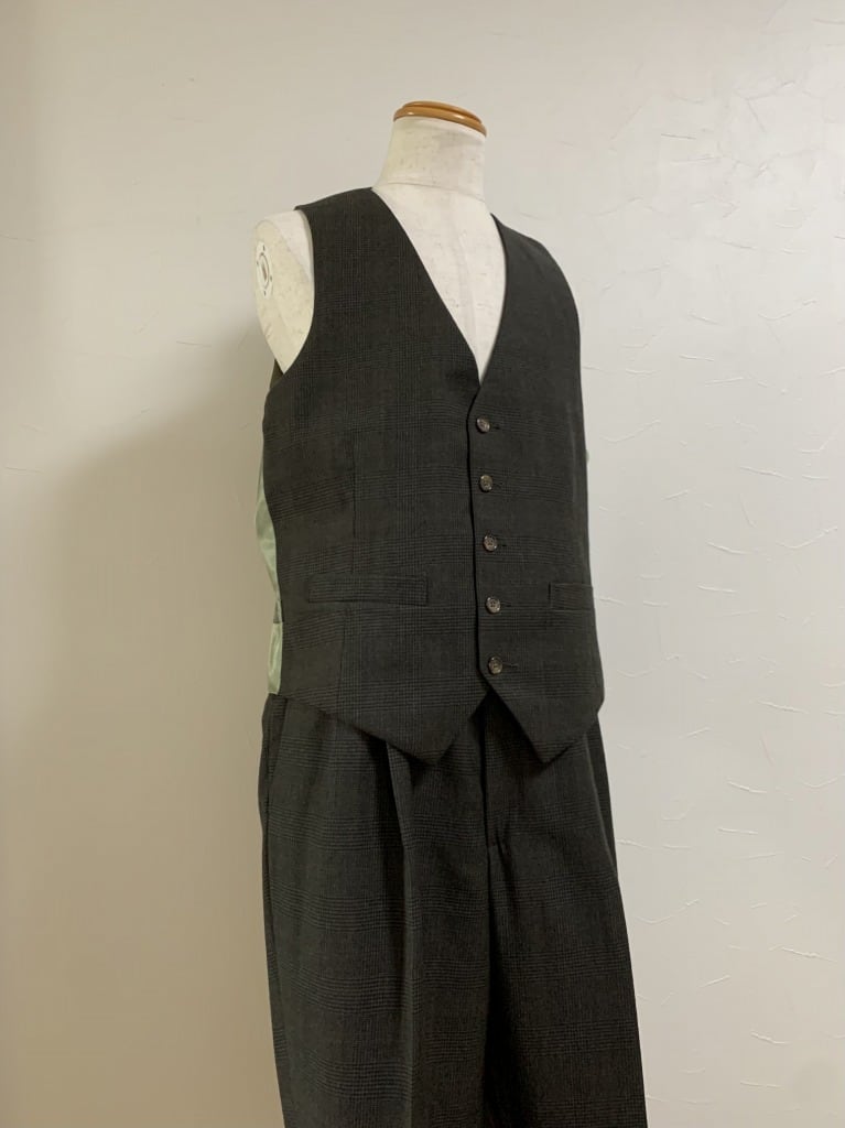 平置きサイズ:ベスト 肩幅 33cm 身幅 ~56cm(後ろ身頃のシンチバックで調節できる為) 着丈 67.5cm パンツ ウエスト 43cm 股下 67cm 股上 33cm
