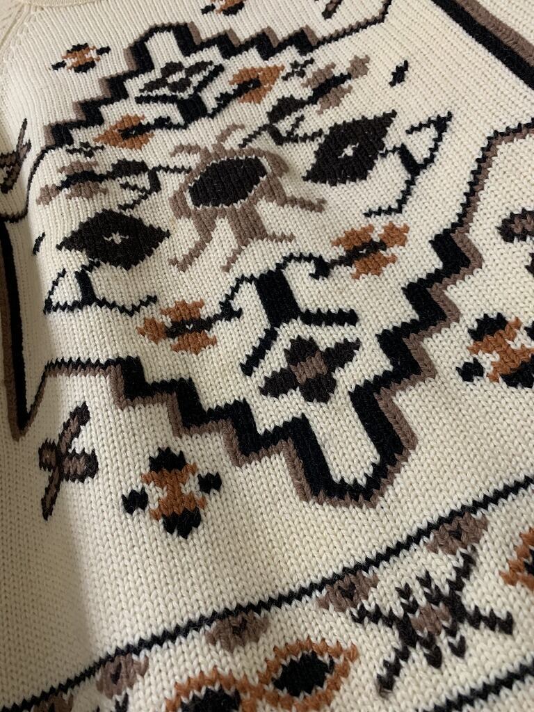 フロントや袖に施された編み柄パターン