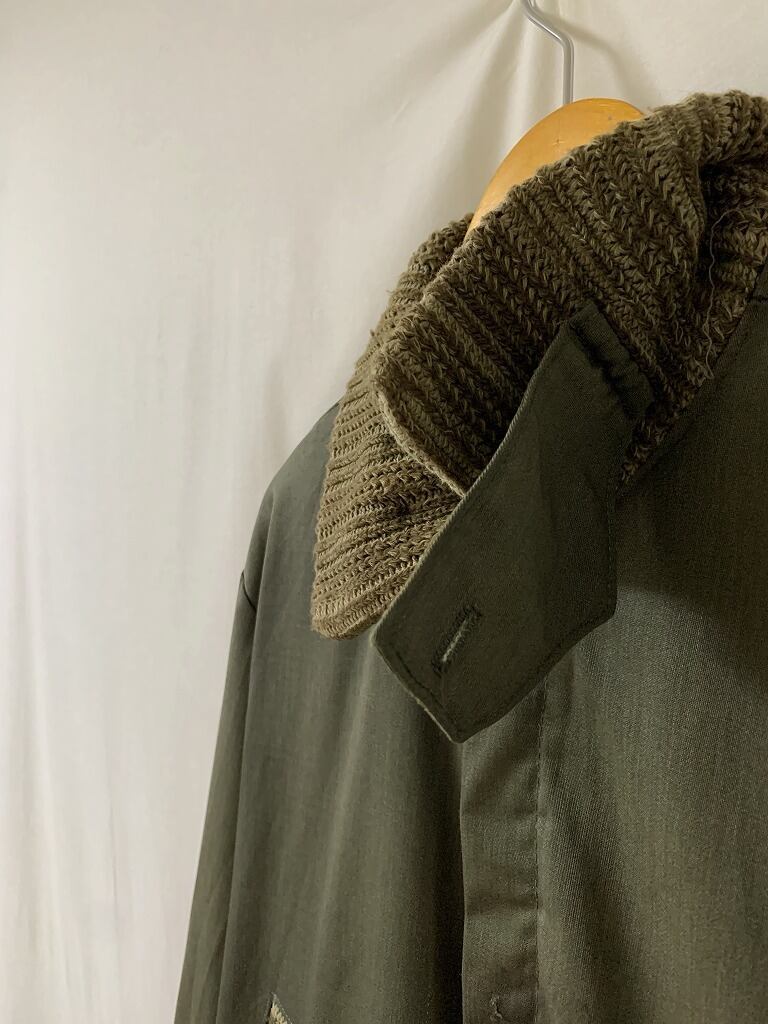 襟とポケットにされた、ニット素材の切り替えデザイン