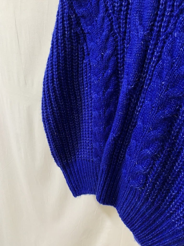 フロントや袖に施された、立体的なケーブルの編み柄