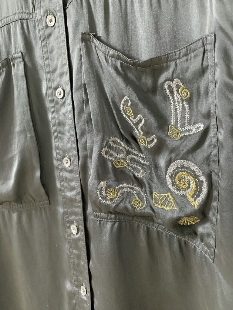 襟や胸ポケットにアシンメトリーに施された刺繍デザイン